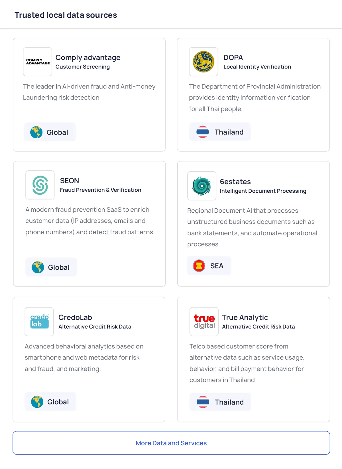 Prebuilt integrations with regional registries and AML sources to accelerate risk-based verification.